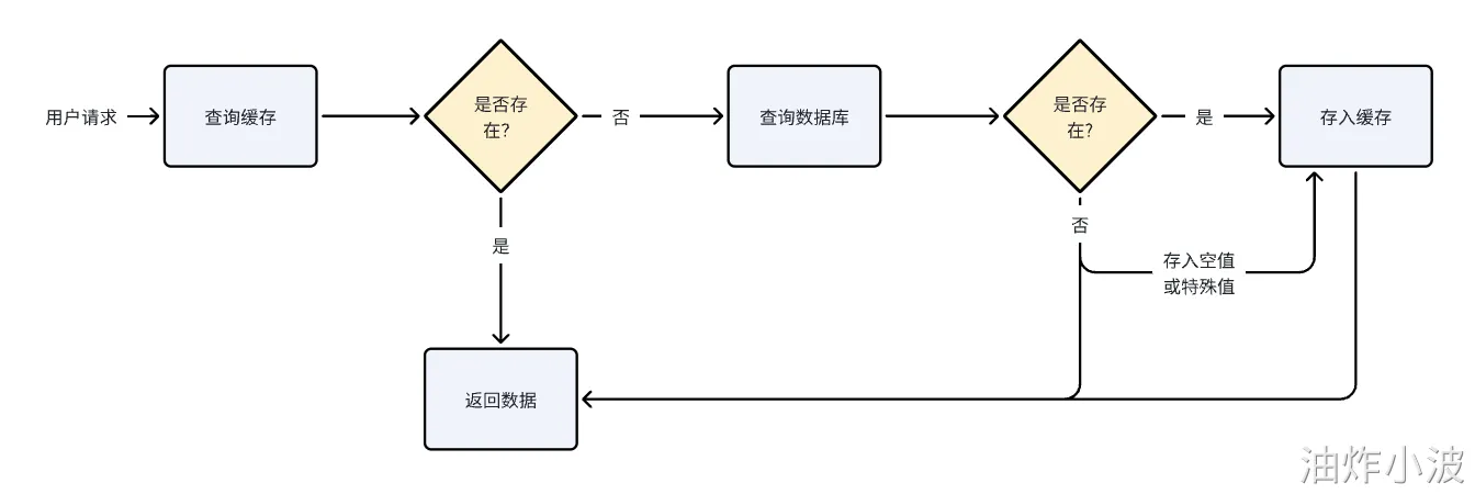 当查询数据库得到的数据不存在,此时我们仍然去缓存数据,缓存一个空值或一个特殊值的数据,避免每次都会查询数据库,避免缓存穿透。流程如下: