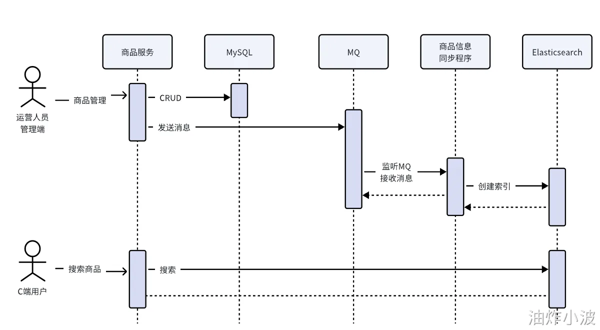 异步方式是通过引入MQ实现,修改商品信息时向MQ发送修改的商品信息,然后监听MQ的程序请求ES向索引写入,流程如下: