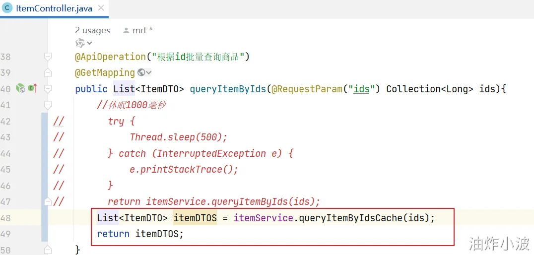 @Override public List<ItemDTO> queryItemByIdsCache(Collection<Long> ids) { //定义空列表 List<ItemDTO> itemDTOList = new ArrayList<>(); ids.stream().forEach(id->{ //先查询缓存 ItemDTO itemCache = (ItemDTO) redisTemplate.opsForValue().get("hmall:item:" + id); //如果缓存有则转为ItemDto if(Objects.nonNull(itemCache)){ ItemDTO itemDTO = BeanUtils.copyBean(itemCache, ItemDTO.class); itemDTOList.add(itemDTO); }else{ //查询数据库 Item itemDB = getById(id); if(Objects.nonNull(itemDB)){ //将数据库查询到的数据放入缓存 redisTemplate.opsForValue().set("hmall:item:" + id,itemDB); //转为ItemDto ItemDTO itemDTO = BeanUtils.copyBean(itemDB, ItemDTO.class); itemDTOList.add(itemDTO); }else{ ItemDTO itemDTO = new ItemDTO(); itemDTO.setName("商品已下架"); //向缓存设置空值【缓存穿透】 redisTemplate.opsForValue().set("hmall:item:" + id,itemDTO); } } }); return itemDTOList; }