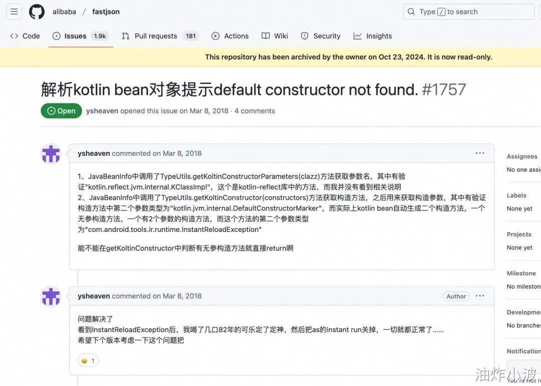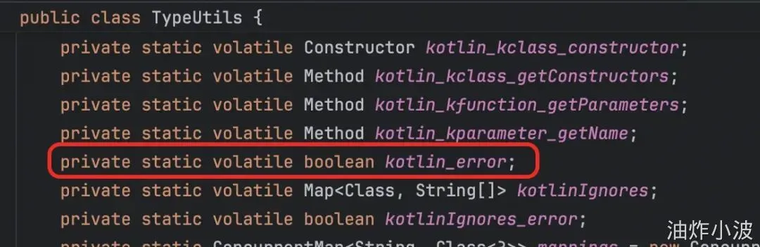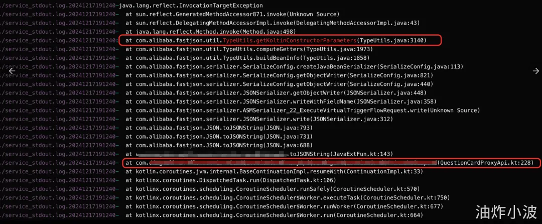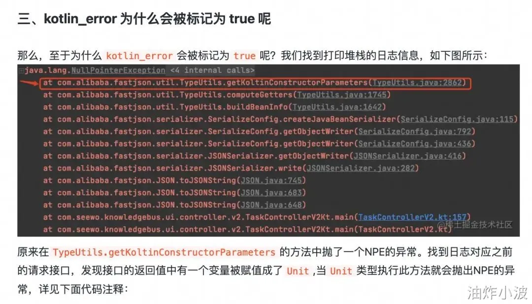文章对FastJson剖析挺深,感觉我们的工程不至于这么奇葩吧。还提到了什么getKoltinConstructorParameters、Unit变量、kotlin_error标记位问题。核心原因是有个静态标记位被置为异常状态。