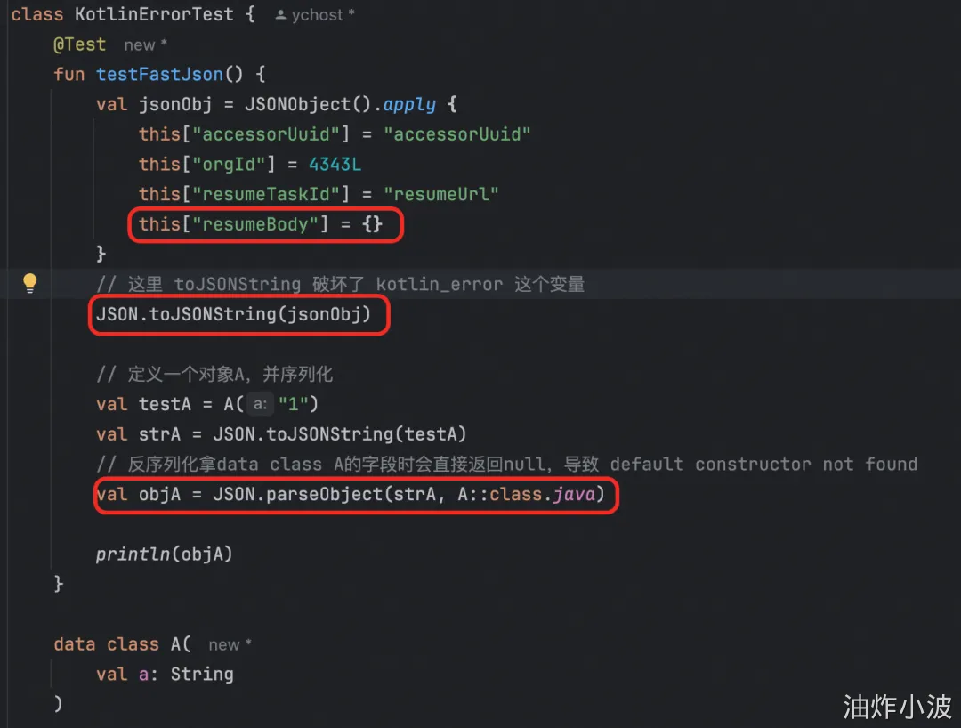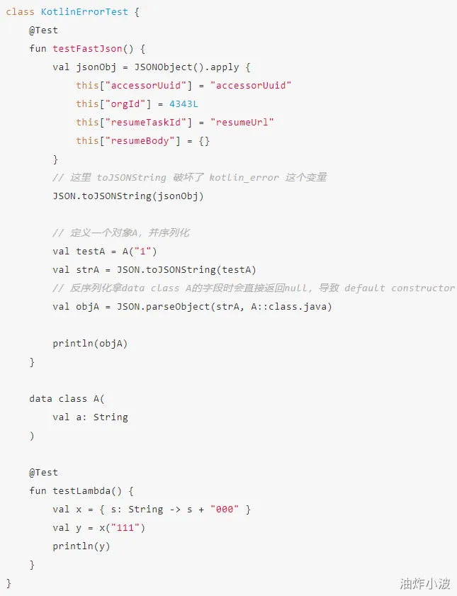 FastJson自然无法正确解析这样的一个Object字段,而最令人细思极恐的问题是 解析这个对象报了错,却把kotlin_error置为true,而后有没有地方将其复原为false,导致所有的反序列化都进到这里,返回不正确的结果,错误结果被外层拦截抛出default constructor not found异常。这个影响面是巨大的,会导致整个工程崩溃。