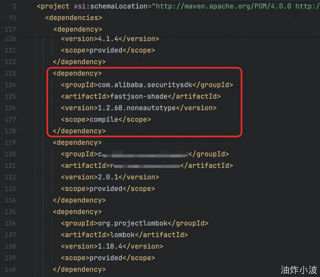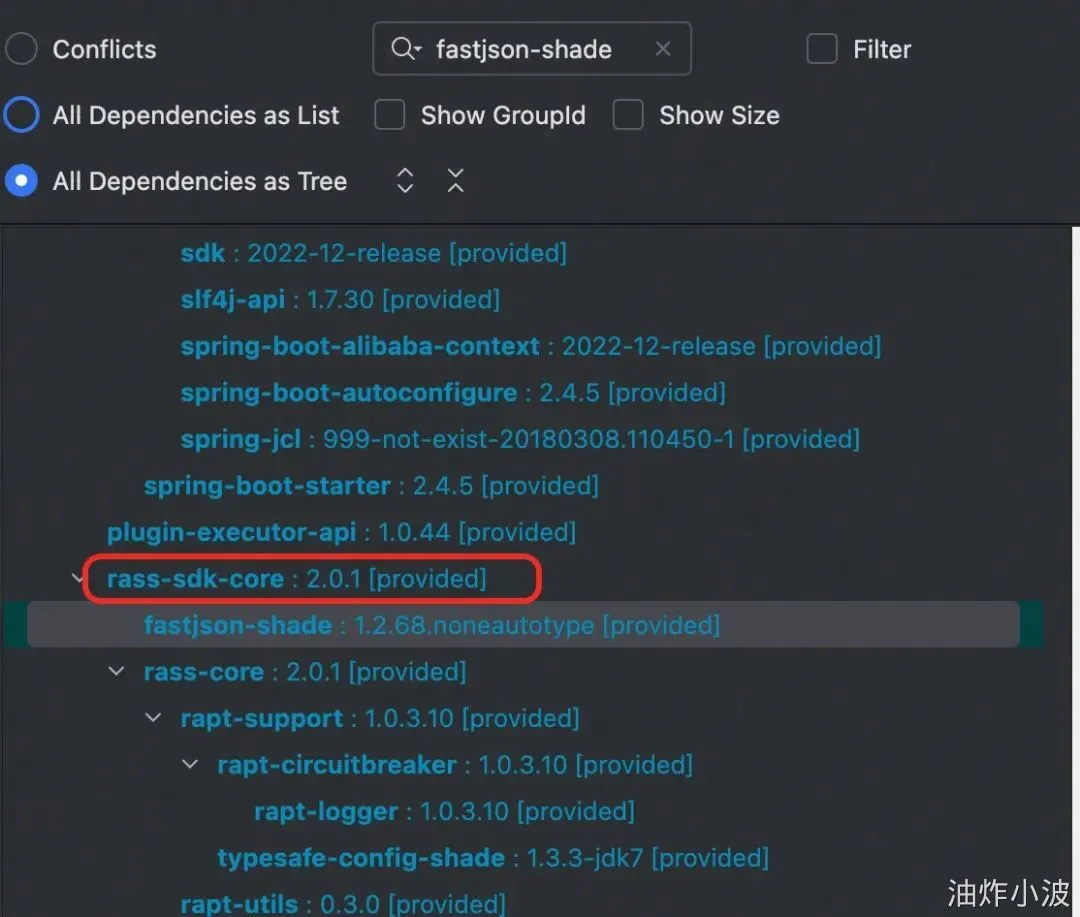 后来登到线上机器对比了一下发现没有这个版本,那有可能就是别的包引入的,于是看了一下出问题module的pom文件,发现果然有这个版本的FastJson,再定位了下发现是rass-sdk-core引入了这个包,scope为compile,打包时会将这个包编译进工程中。