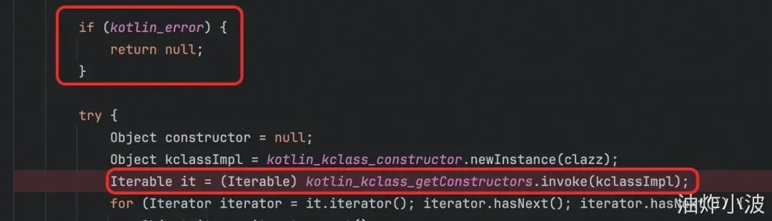 1.一开始 kotlin_error !=true ,会进到 kotlin_kclass_getConstructors.invoke获取类构造器,这里抛错了,把kotlin_error改为true;