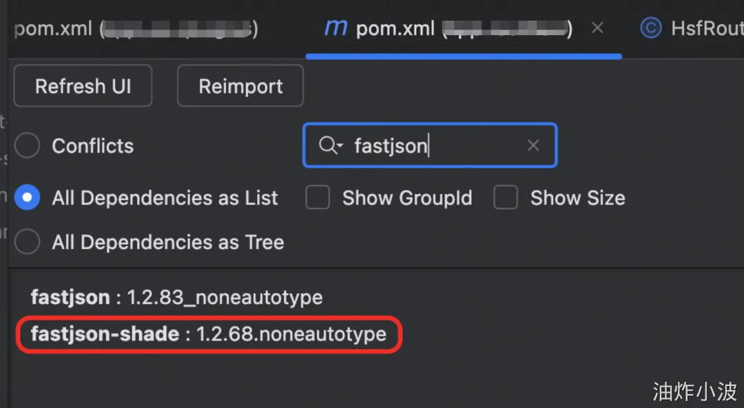 很果断的将该包中的FastJson排掉,那问题铁定解决了,观察了日志发现没有再抛错,我就没再管。到了下午同学又来反馈有问题,我一看还真是,难道是搞错了。