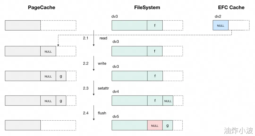 - 1.3:另一个 EFC 客户端在缓冲不命中的情况下,从文件系统读取了 dv2 版本的 NULL 数据,并写到分布式缓存中;