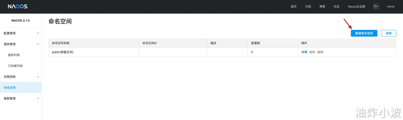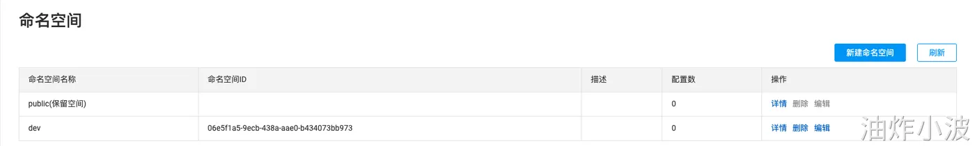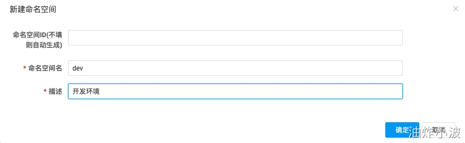 日常开发过程中,我们一般会有dev、test、poc、prod等多个环境,同一个服务不同环境之间因存在代码不一致问题肯定需要做隔离调度,Nacos通过namespace解决此问题,配置页面如下,我们新增一个dev: