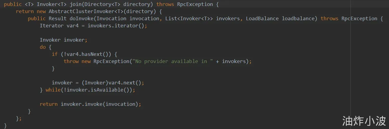 源码的这个写法是比较优雅的,遍历所有的Invokers判断invoker.isAvalible,只要一个有为true直接调用返回,否则就抛出异常。