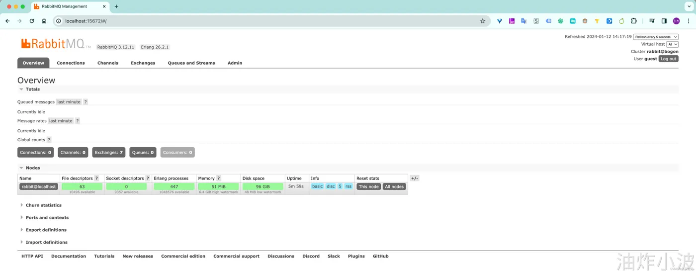接着,我们在浏览器中打开 RabbitMQ 的本地操作界面:http://localhost:15672/,其中的“15672”是 RabbitMQ 启动时的默认窗口。你可以使用默认的内置用户登录系统,用户名和密码都是 guest。顺利登录后你会看到如下页面: