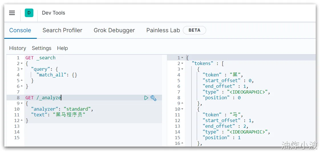 GET /_analyze { "analyzer": "standard", "text": "黑马程序员" }