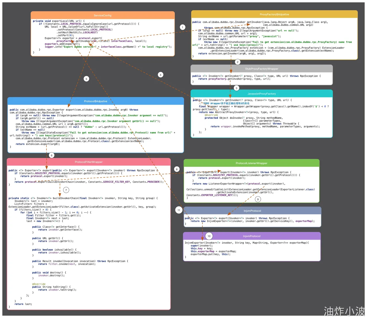 比如图中的1-4就是对应具体服务到invoker的转换,5-11对应Invoker转换为Exporter