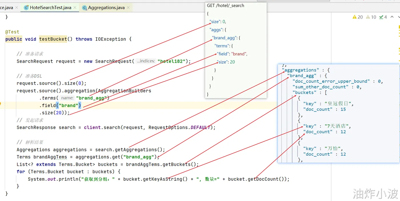 @Test public void testBucket() throws IOException { // 准备请求 SearchRequest request = new SearchRequest("hotel182"); // 准备DSL request.source().size(0); request.source().aggregation(AggregationBuilders .terms("brand_agg") .field("brand") .size(20)); // 发起请求 SearchResponse search = client.search(request, RequestOptions.DEFAULT); // 解析结果 Aggregations aggregations = search.getAggregations(); Terms brandAggTems = aggregations.get("brand_agg"); List<? extends Terms.Bucket> buckets = brandAggTems.getBuckets(); for (Terms.Bucket bucket : buckets) { System.out.println("获取到分组:" + bucket.getKeyAsString() + ", 数量=" + bucket.getDocCount()); } }