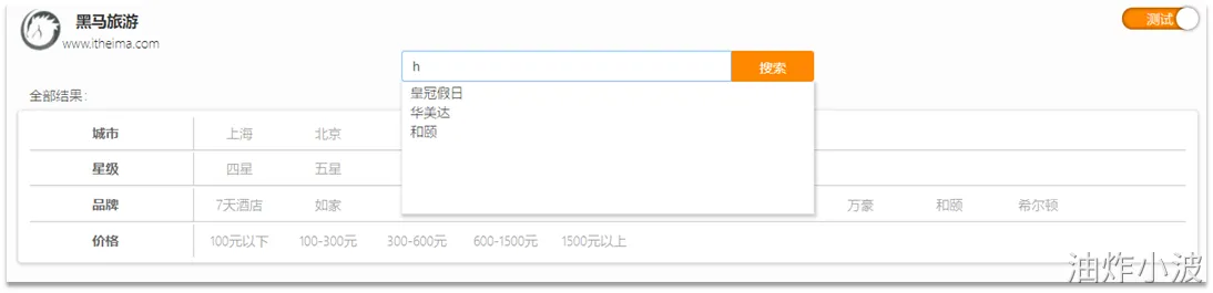 分析:目前,页面的城市列表、星级列表、品牌列表都是写死的,并不会随着搜索结果的变化而变化。但是用户搜索条件改变时,搜索结果会跟着变化。例如:用户搜索“东方明珠”,那搜索的酒店肯定是在上海东方明珠附近,因此,城市只能是上海,此时城市列表中就不应该显示北京、深圳、杭州这些信息了。