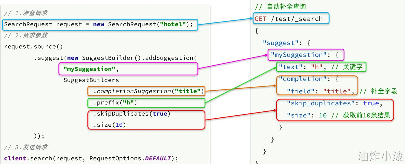 之前我们学习了自动补全查询的DSL,而没有学习对应的JavaAPI,这里给出一个示例: