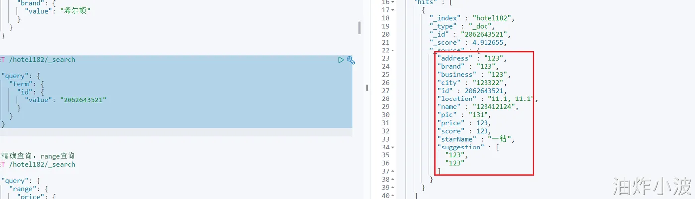 GET /hotel182/_search { "query": { "term": { "id": { "value": "2062643521" } } } }