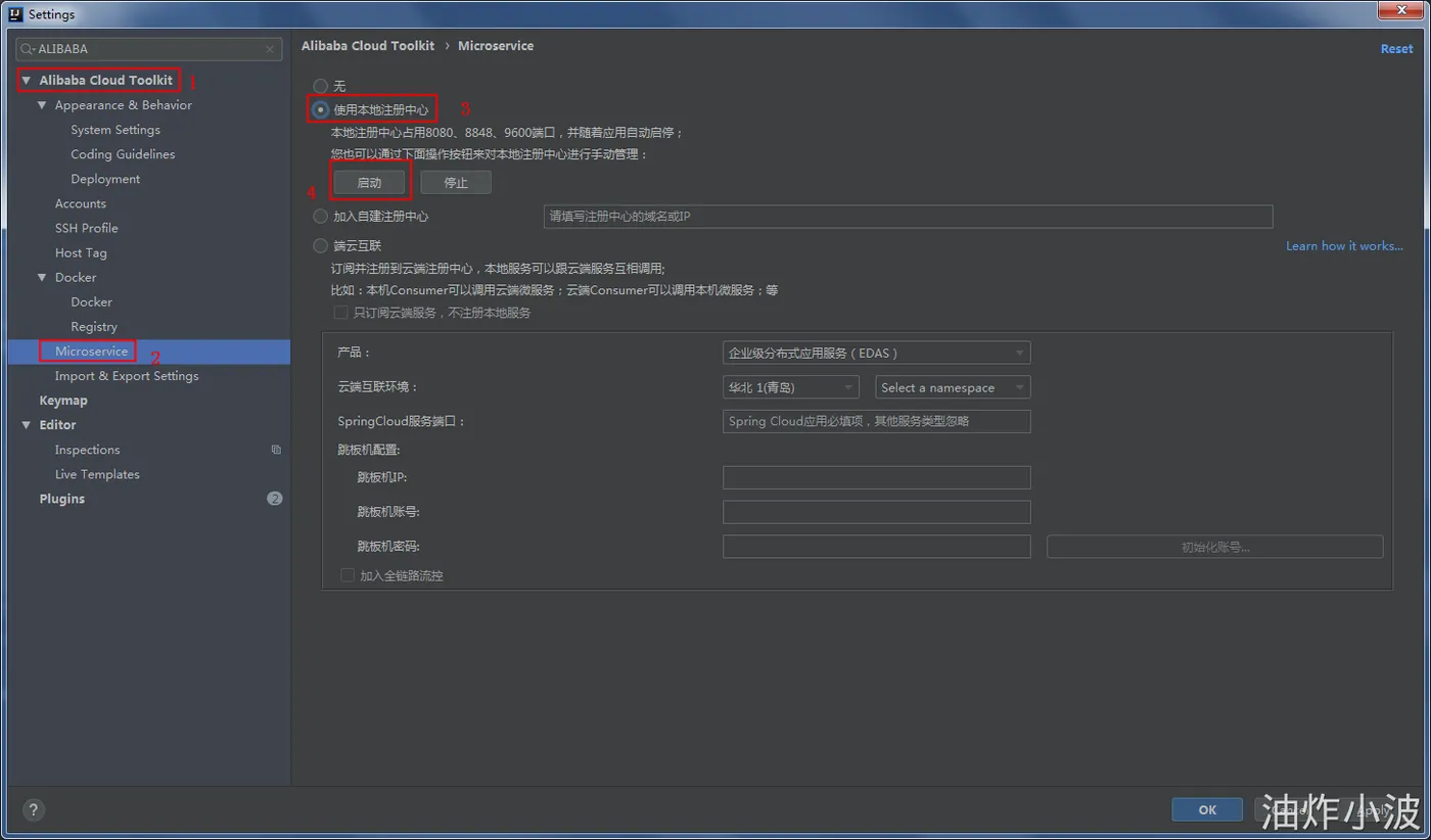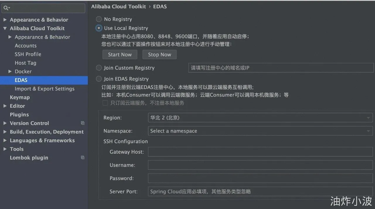 下载完生成的项目工程之后,对于常规 Spring Cloud 应用开发开发流程,下一步是需要去找一个(或本地搭建一个)注册中心(如:Nacos),这个过程往往是需要花费一定时间的。去年年底我们在阿里云的 IDE 插件 Cloud Toolkit 中开发了一个自动拉起/选择注册中心, 并将应用自动适配到所选择的注册中心的功能。界面如下图: