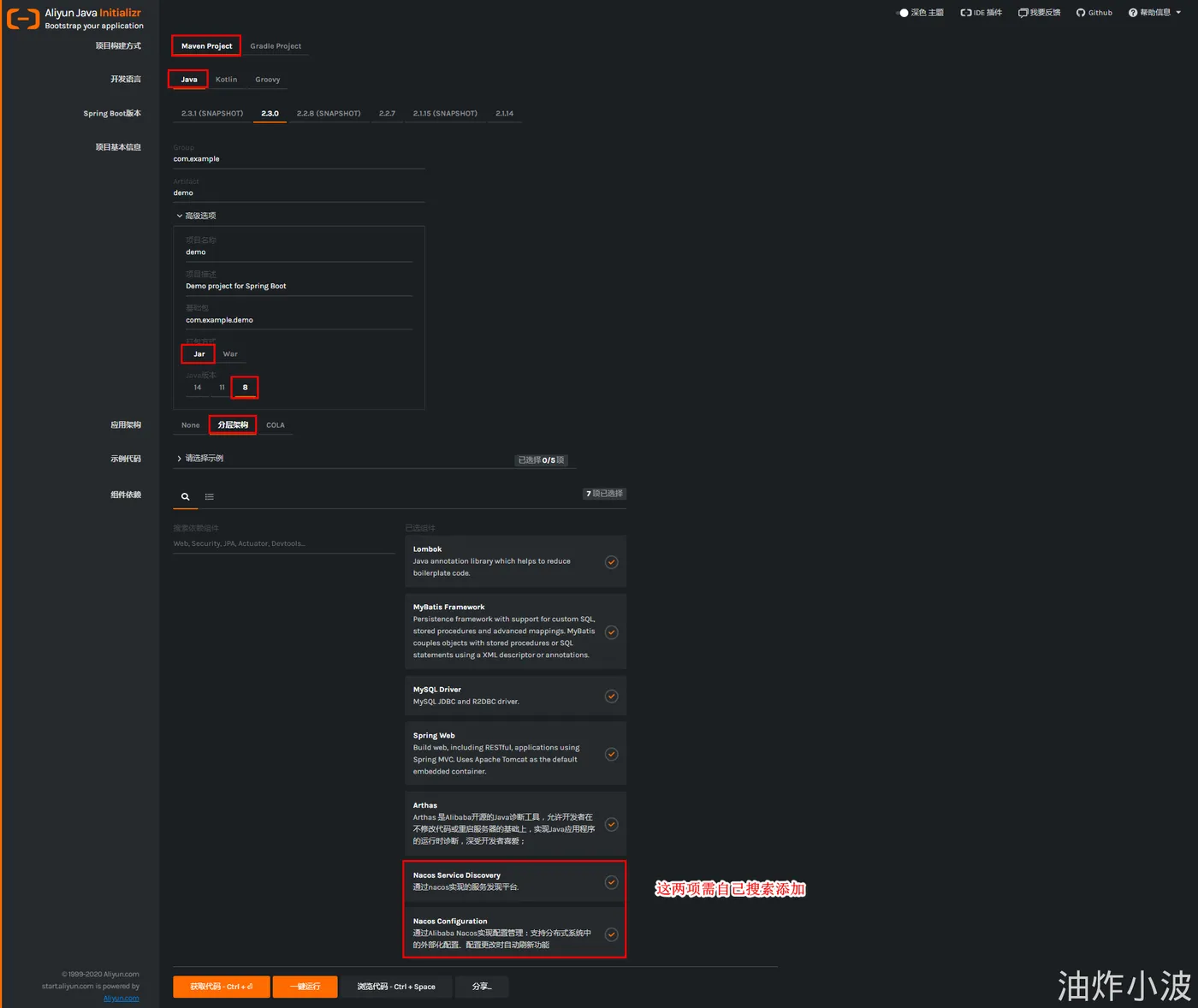 我们通过这个页面提供了一个生成 Java 应用(不只是 SpringCloud 应用)的白屏化工具,对于一个最简单的 Spring Cloud 应用,只有一项是您必须要选择的依赖,就是 Spring Cloud Alibaba 选项卡下的 Nacos Service Discovery 组件。选中之后,点击按钮组中橙色的 “生成” ,工具会根据所需的依赖自动生成一份可直接打包运行的 pom.xml 文件,同时将所有内容打成一个标准的 Java 项目工程包供您下载。