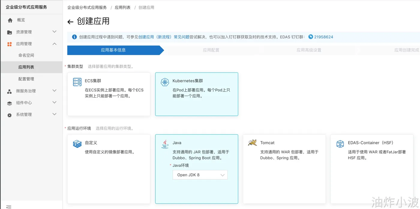 注:EDAS 中的应用,运行时就是被 OAM 控制器管控下的 Kubernetes 的 Deployment,因此除了通过上述方式创建 EDAS 应用之外,EDAS 也能将集群中的 Deployment 读取出来,您可以将这些Deployment直接转成一个 EDAS 应用。这里如果有朋友对 EDAS 应用 与 Deployment 之间的转换感兴趣的话,我们在专门的章节中细讲。
