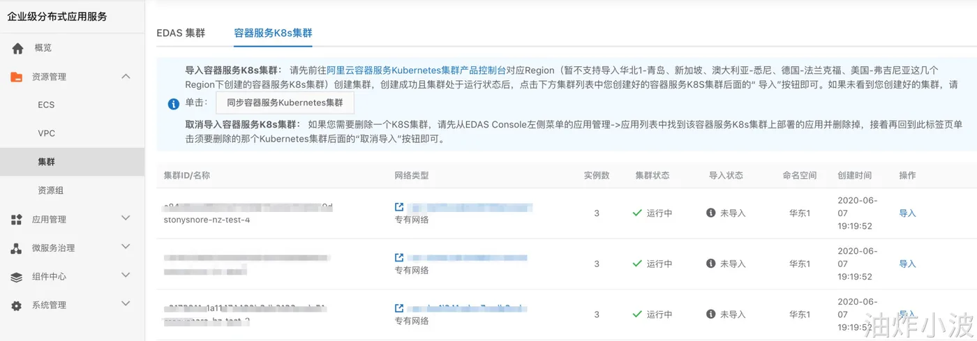 等到 Kubernetes 集群就绪之后,在 EDAS 上需要进行一次集群“导入”,导入方式如下图所示: