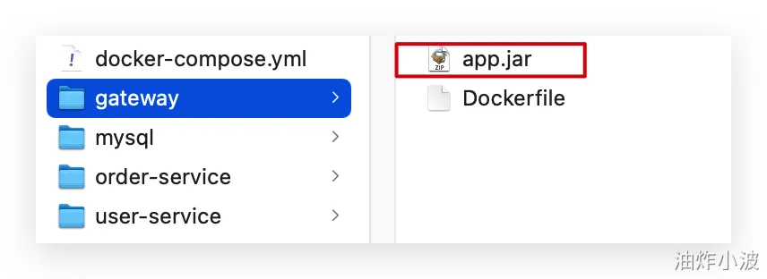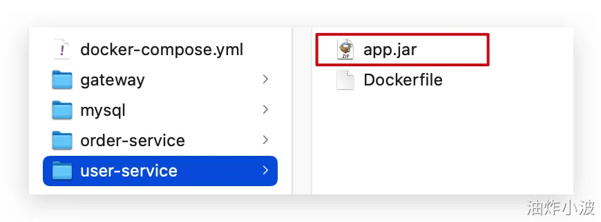 编译打包好的app.jar文件,需要放到Dockerfile的同级目录中。注意:每个微服务的app.jar放到与服务名称对应的目录,别搞错了。