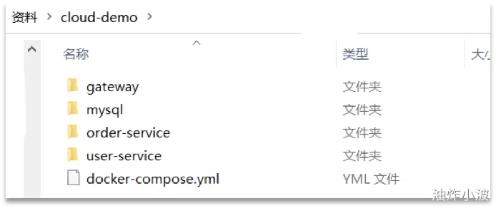 查看课前资料提供的cloud-demo文件夹,里面已经编写好了docker-compose文件,而且每个微服务都准备了一个独立的目录