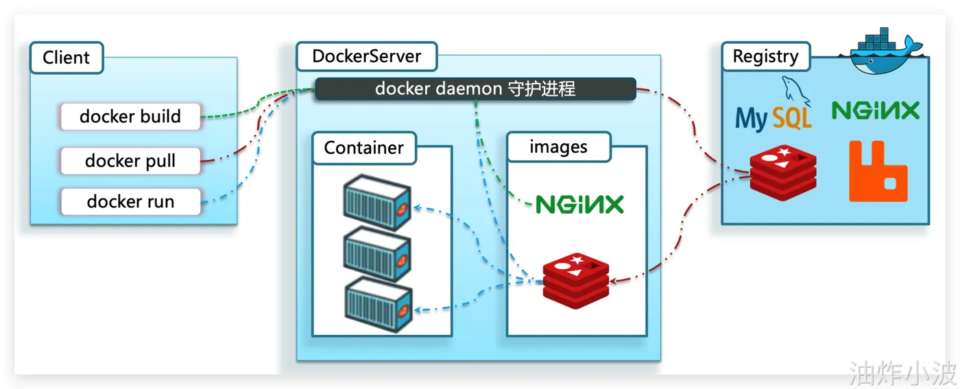 - 服务端(server):Docker守护进程,负责处理Docker指令,管理镜像、容器等