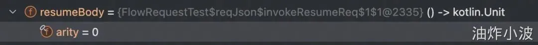 再看debug信息,这里resumeBody实际上被解释为 ()->kotlin.Unit 这样一个lambda函数,arity表示函数的参数数量为0.