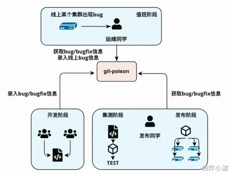 git-poison的出现,不仅能实时在“开发,测试,发布”间同步所有已知问题,还能参与发布卡点,确认当前版本的未修复bug信息,节约人力成本。