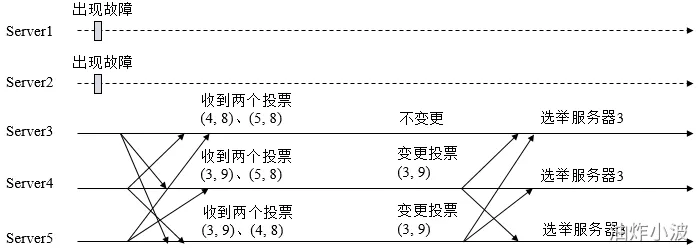 (4) 统计投票。每次投票后,服务器都会统计投票信息,判断是否已经有过半机器接受到相同的投票信息,对于Server1、Server2而言,都统计出集群中已经有两台机器接受了(2, 0)的投票信息,此时便认为已经选出Leader。