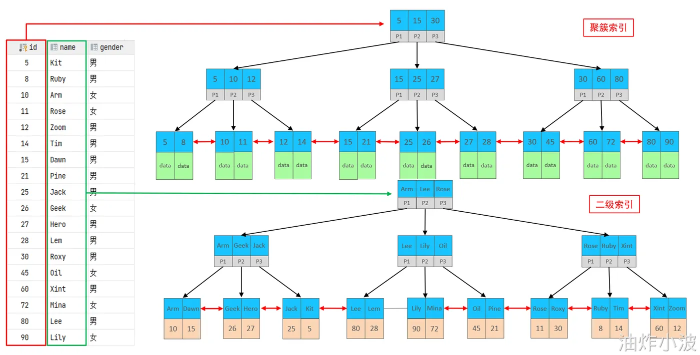 - 而如果索引结构是Btree,在B树中,非叶子节点和叶子节点既要要存储key和指针,还要存放数据,而InnoDB的物理存储结构中,一页(Page)的大小是固定的,就是16KB。 那这一页中能够存储的key的数量并不多,就会造成大数据量情况下,树的层级较深,检索速度慢。 还有一个问题,就是由于 非叶子节点和叶子节点既要要存储key,还要存放数据,查找效率并不稳定。 (有些数据,只需要一次查找,有些数据,可能需要五六次,有些...)