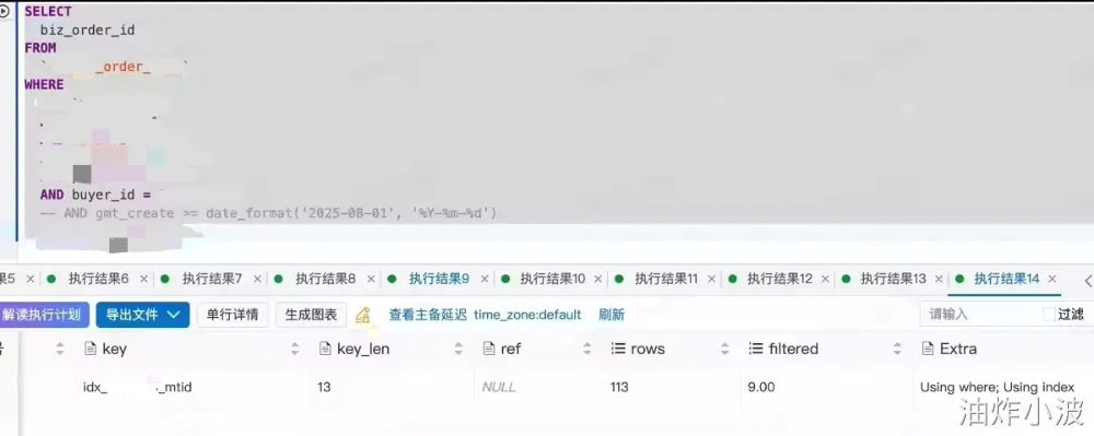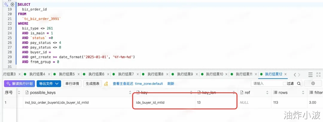 明确增加order_id排序的原因后,就制定了一种风险相对较小的优化方式,把非tm2订单列表即不带m_tid字段的分页查询请求中的order_id排序去掉,预期这类SQL应该走老索引ind_***_buyerid,从而保证返回的订单列表的稳定。放量完成后发现不带m_tid字段的分页查询请求也会走到新索引 idx_****_mtid,如下:
