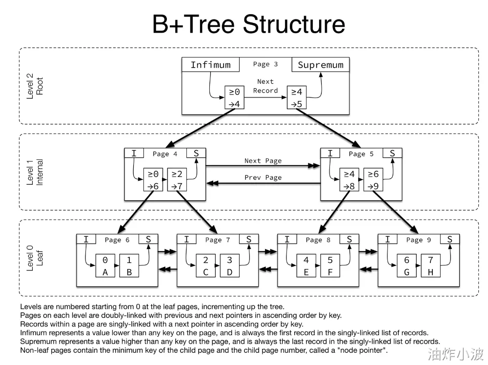 B+Tree中单个节点实际对应一个16kb的物理Page,Page的Fil Header中会维护两个链表指针,指向相邻的两个Page,通过这两个指针,每一层的Page都会组成一个横向的Page双向链表,从而支持双向遍历,提升列表查询效率。每个Page中会包含多条索引记录Record,各个Record在逻辑上基于索引列值升序排列并组成一个单向链表,这些称为User Records。Page内预留了两个固定位置固定值的System Records,在链表头的Infimum记录以及在链表尾的Supremum记录,Infimum指向索引值最小的Record,Supremum通常为null。Page内部还会维护一组Directory slot,每个Directory slot指向一个Record记录,两个Directory slot对应的Record记录中间会相隔4到8个Record记录,实际在Page内部查找满足条件的Record记录时先根据Directory slot做二分查找找到相邻的两个slot记录,再顺序遍历这两个slot中间的Record记录,从而提升查找效率。