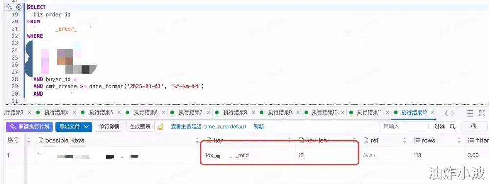 该用户下创单最早的订单都是大于2025-01-01,初步怀疑create_time大于2025-01-01的查询条件被索引选择器直接忽略。如果把查询时间去掉,也是走新索引 idx_****_mtid,相比老索引可以有更多的字段走索引过滤,符合预期。