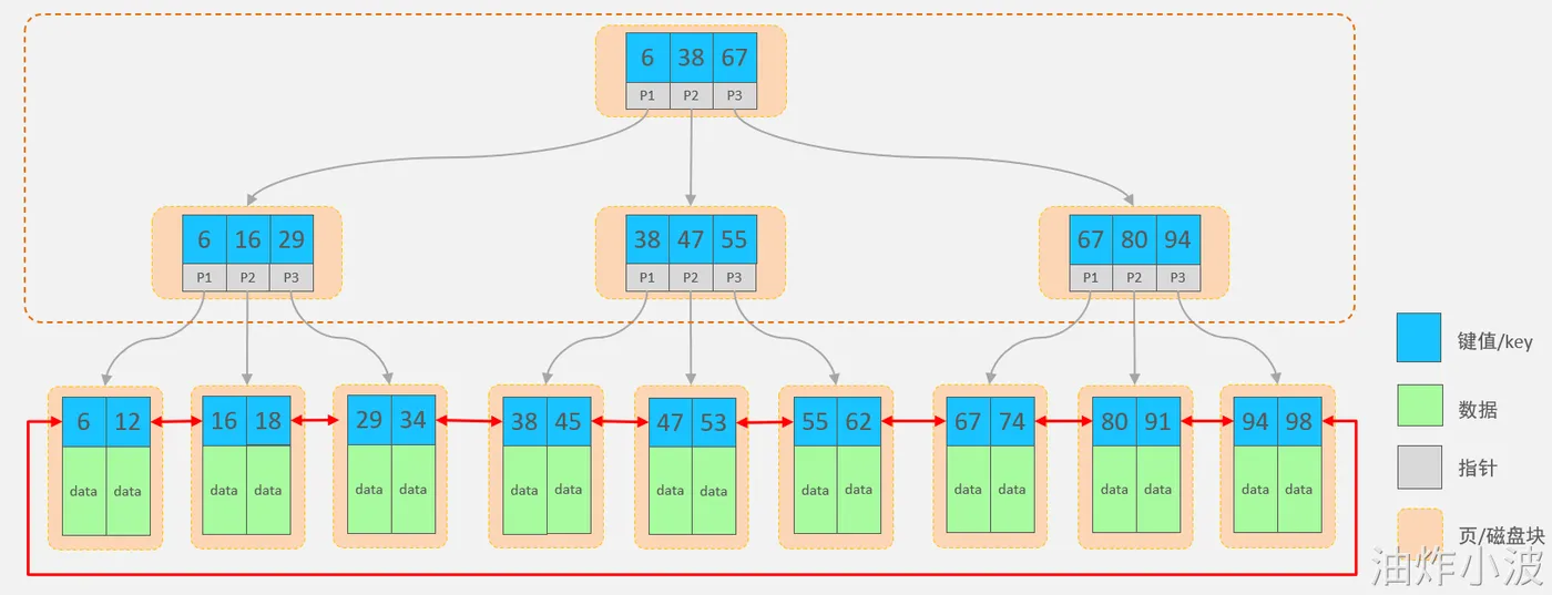 - 而在B+tree的叶子节点中,形成了一个双向链表,便于区间范围查询。