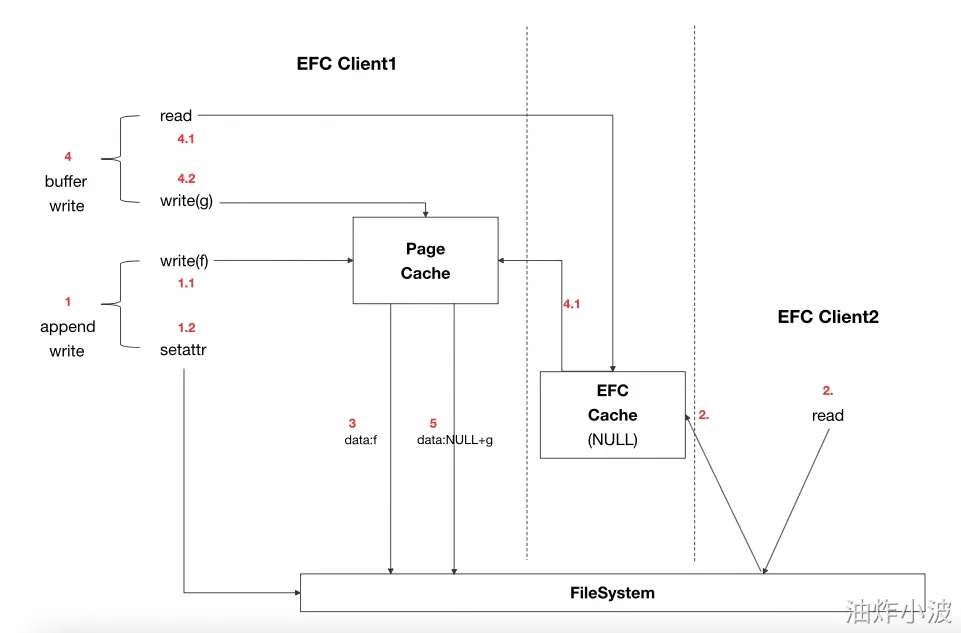 - 1.3:另一个 EFC 客户端在缓冲不命中的情况下,从文件系统读取了 dv2 版本的 NULL 数据,并写到分布式缓存中;