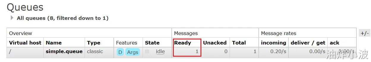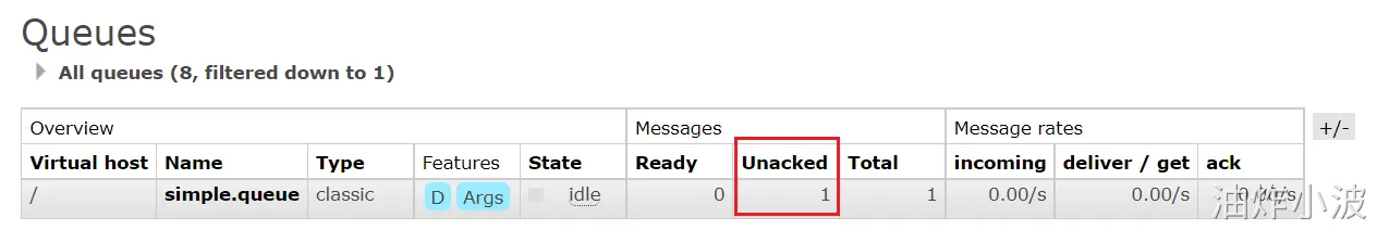 抛出异常后,因为Spring会自动返回nack,所以消息恢复至Ready状态,并且没有被RabbitMQ删除: