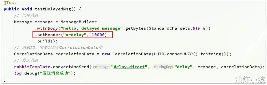 发送消息时,一定要携带x-delay属性,指定延迟的时间: