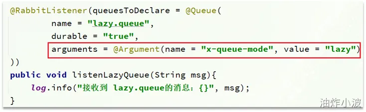 rabbitmqctl:RabbitMQ的命令行工具set_policy:添加一个策略Lazy:策略名称,可以自定义"^lazy-queue$":用正则表达式匹配队列的名字'{"queue-mode":"lazy"}':设置队列模式为lazy模式--apply-to queues:策略的作用对象,是所有的队列