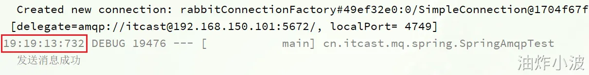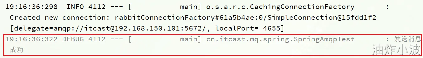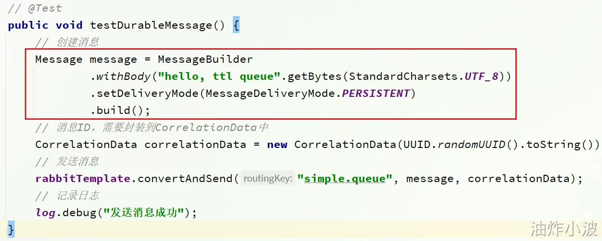 public void testSendMessage2SimpleQueue() throws InterruptedException { // 1.消息体 String message = "hello, spring amqp!"; // 2.全局唯一的消息ID,需要封装到CorrelationData中 CorrelationData correlationData = new CorrelationData(UUID.randomUUID().toString()); // 3.添加callback correlationData.getFuture().addCallback( result -> { if(result.isAck()){ // 3.1.ack,消息成功 log.debug("消息发送成功, ID:{}", correlationData.getId()); }else{ // 3.2.nack,消息失败 log.error("消息发送失败, ID:{}, 原因{}",correlationData.getId(), result.getReason()); } }, ex -> log.error("消息发送异常, ID:{}, 原因{}",correlationData.getId(),ex.getMessage()) ); // 4.发送消息 rabbitTemplate.convertAndSend("task.direct", "task", message, correlationData); // 休眠一会儿,等待ack回执 Thread.sleep(2000); }