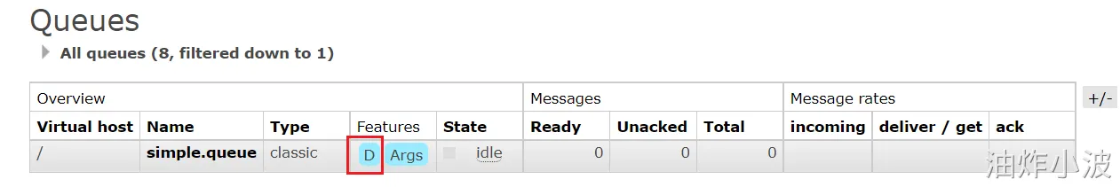事实上,默认情况下,由SpringAMQP声明的队列都是持久化的。可以在RabbitMQ控制台看到持久化的队列都会带上D的标示: