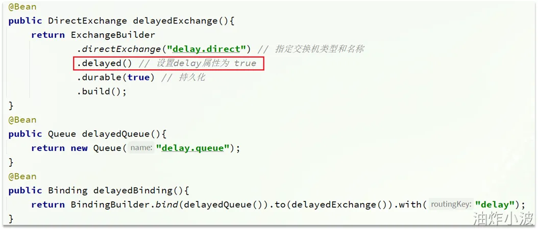 RabbitMQ中队列默认是非持久化的,mq重启后就丢失。SpringAMQP中可以通过代码指定交换机持久化: