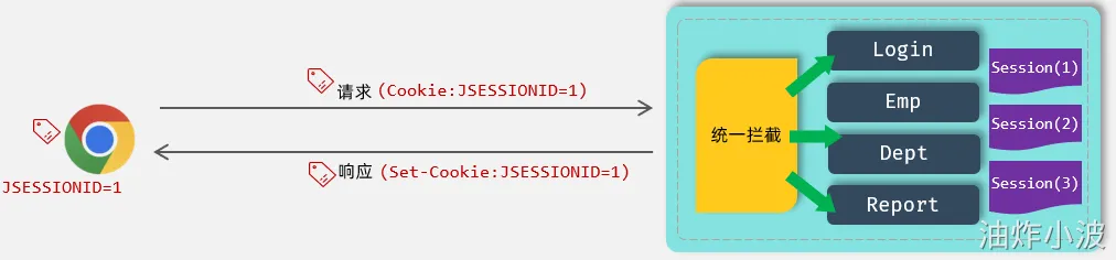 - 浏览器接收到Cookie之后,就会自动将Cookie的值(JSESSIONID)存储起来,然后在后续访问服务器的时候,再将Cookie的值(JSESSIONID)携带到服务器。 在服务器中,就可以根据 JSESSIONID的值,找到对应的会话对象Session,从而操作会话对象Session中的数据了。