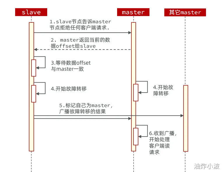 利用cluster failover命令可以手动让集群中的某个master宕机,切换到执行cluster failover命令的这个slave节点,实现无感知的数据迁移。其流程如下: