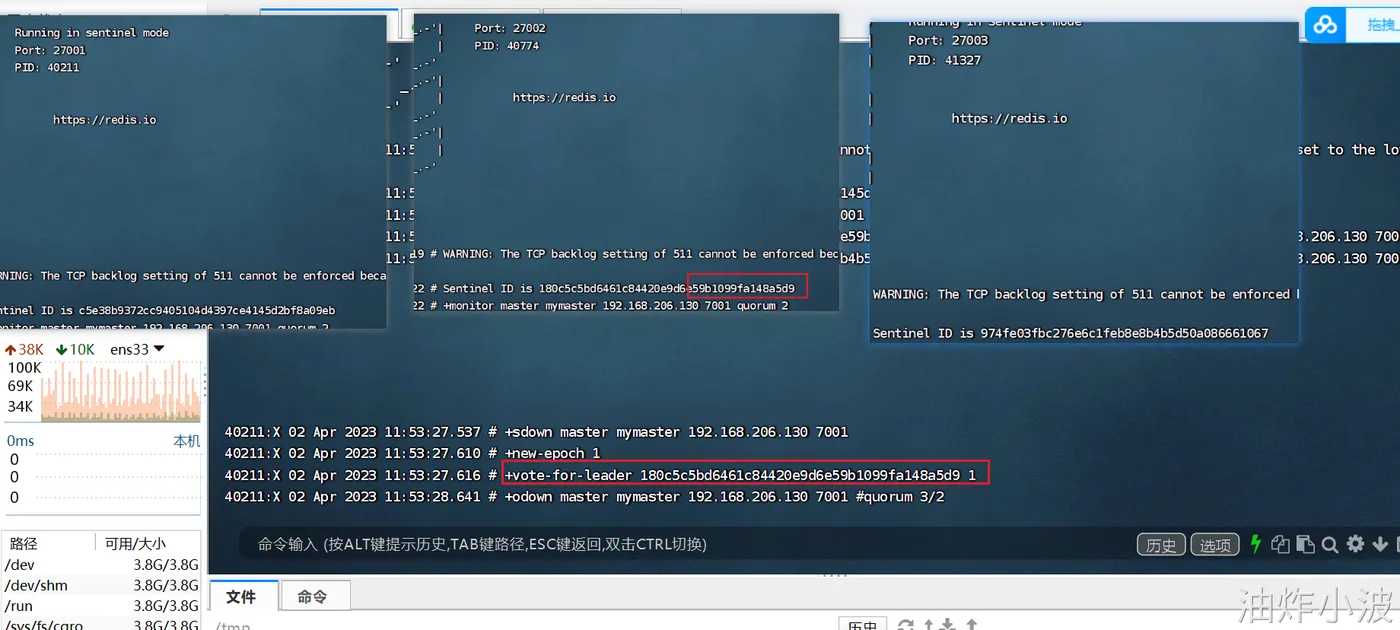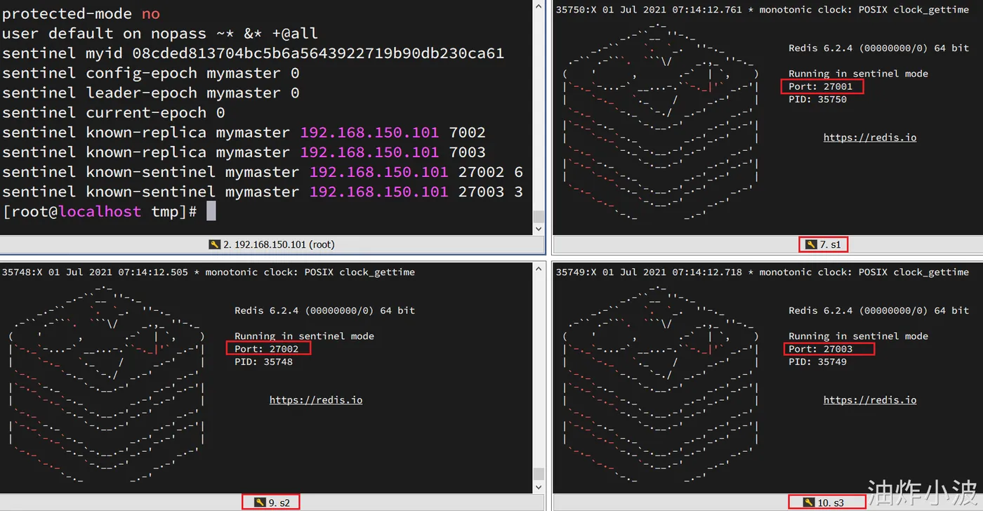 为了方便查看日志,我们打开3个ssh窗口,分别启动3个redis实例,启动命令(在/tmp目录执行下列命令):