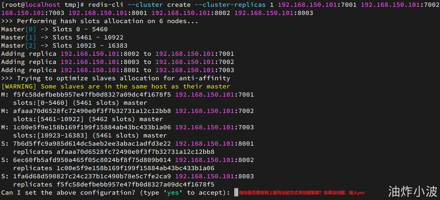 redis-cli --cluster create --cluster-replicas 1 192.168.206.129:7001 192.168.206.129:7002 192.168.206.129:7003 192.168.206.129:8001 192.168.206.129:8002 192.168.206.129:8003