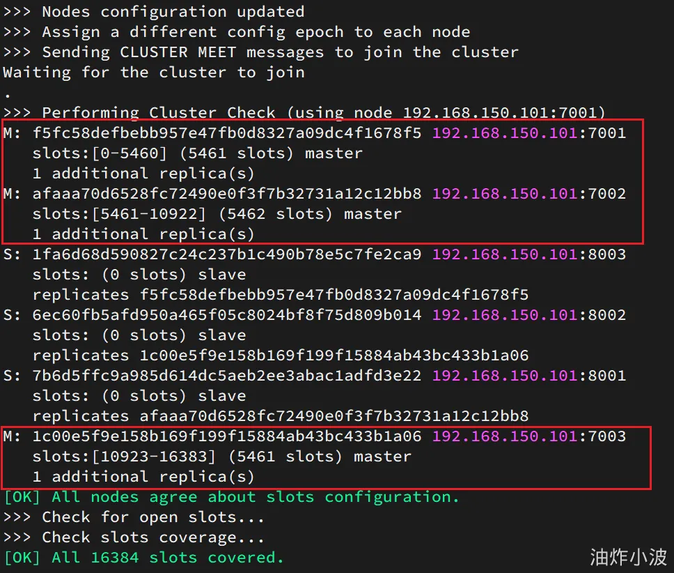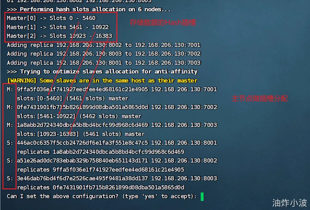 • --replicas 1或者--cluster-replicas 1 :指定集群中每个master的副本个数为1,此时节点总数 ÷ (replicas + 1) 得到的就是master的数量。因此节点列表中的前n个就是master,其它节点都是slave节点,随机分配到不同master