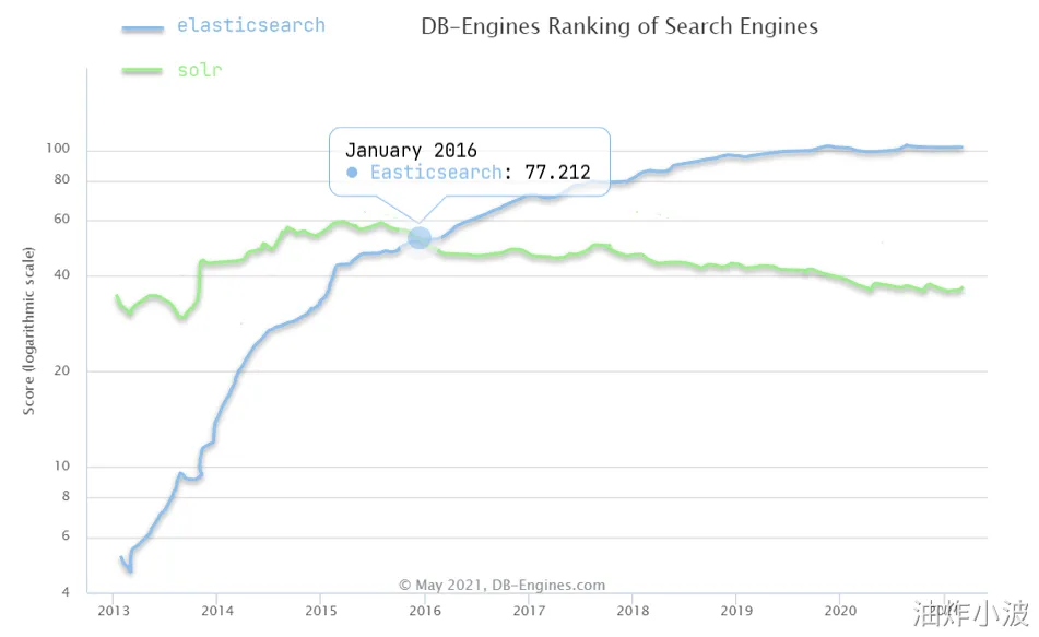 虽然在早期,Apache Solr是最主要的搜索引擎技术,但随着发展elasticsearch已经渐渐超越了Solr,独占鳌头: