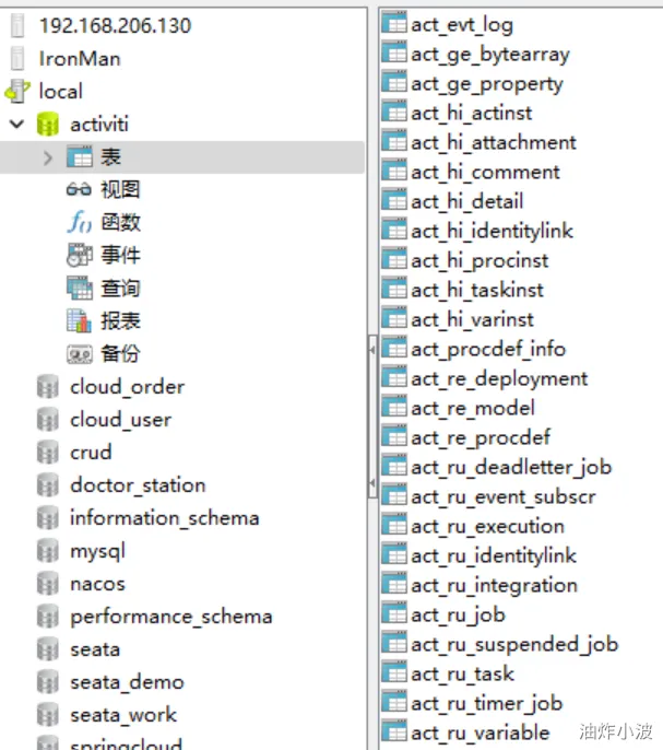 此时我们去刷新数据库,会发现多了25张表,如下(大概表分类我们放在:04-Activiti拓展篇讲解,这里只讲最简单的上手Demo):