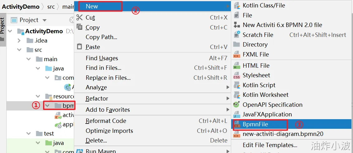 - 右键,新创建一个:bpmnFile,名称随意,这里我们叫:hello.bpmn