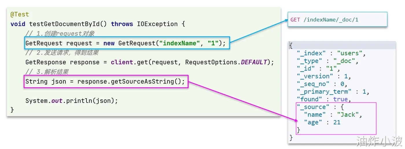 • 发送请求。调用RestHighLevelClient#.xxx()方法,xxx是index、get、update、delete、bulk