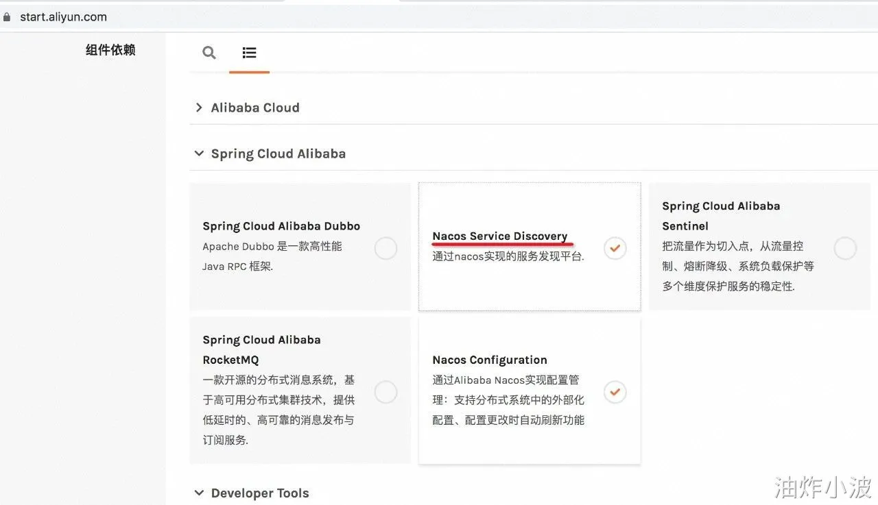 我们通过这个页面提供了一个生成 Java 应用(不只是 SpringCloud 应用)的白屏化工具,对于一个最简单的 Spring Cloud 应用,只有一项是您必须要选择的依赖,就是 Spring Cloud Alibaba 选项卡下的 Nacos Service Discovery 组件。选中之后,点击按钮组中橙色的 “生成” ,工具会根据所需的依赖自动生成一份可直接打包运行的 pom.xml 文件,同时将所有内容打成一个标准的 Java 项目工程包供您下载。